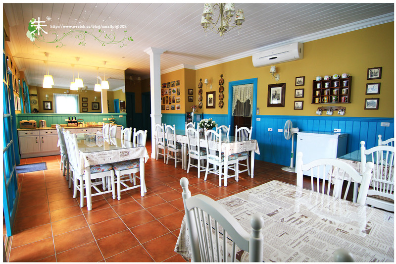 明亮簡潔的餐廳,牆上有好多可愛的裝飾品及馬克杯,